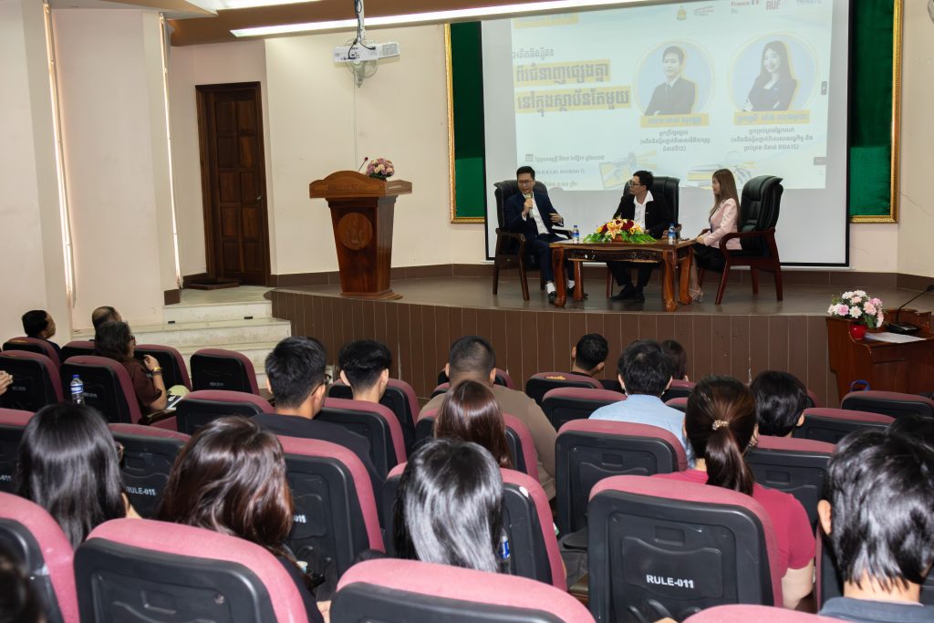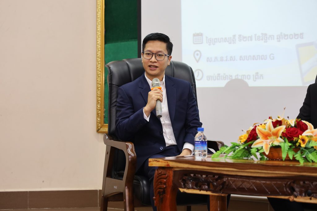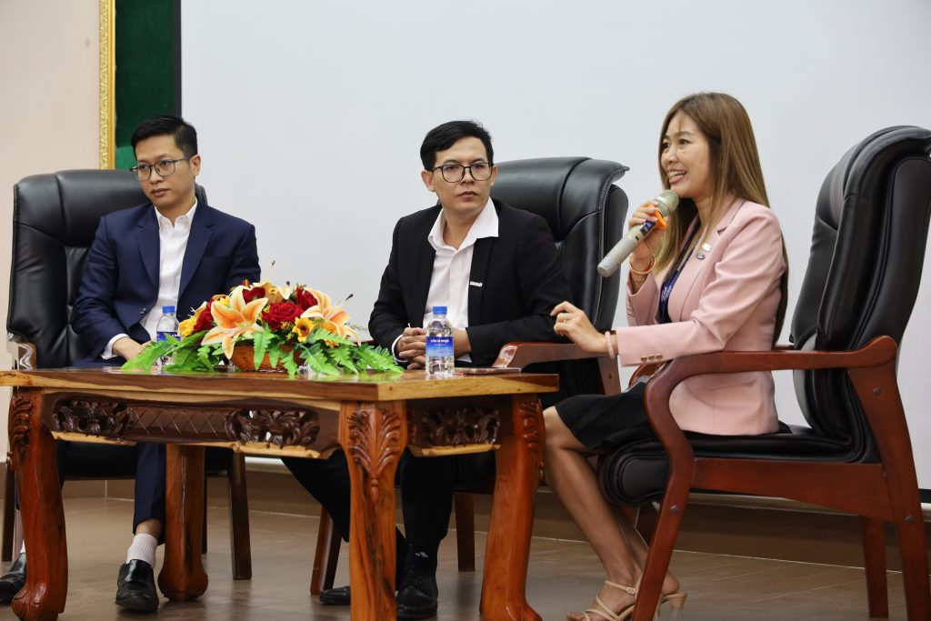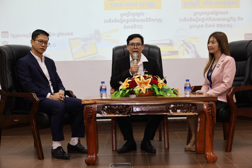 Le deuxième Alumni Talk, organisé le jeudi matin 27 novembre, s’est déroulé sous le thème « Alumni : Deux spécialités pour la même entreprise ». Deux anciens étudiants ont partagé leur parcours : M. Meas Sovan, conseiller juridique chez RMA et ancien étudiant de la filière spéciale de droit, promotion 12, et Mme Aing Leangmuy, directrice commerciale chez RMA et ancienne étudiante de la promotion BBA15 de la filière spéciale en économie et gestion.
