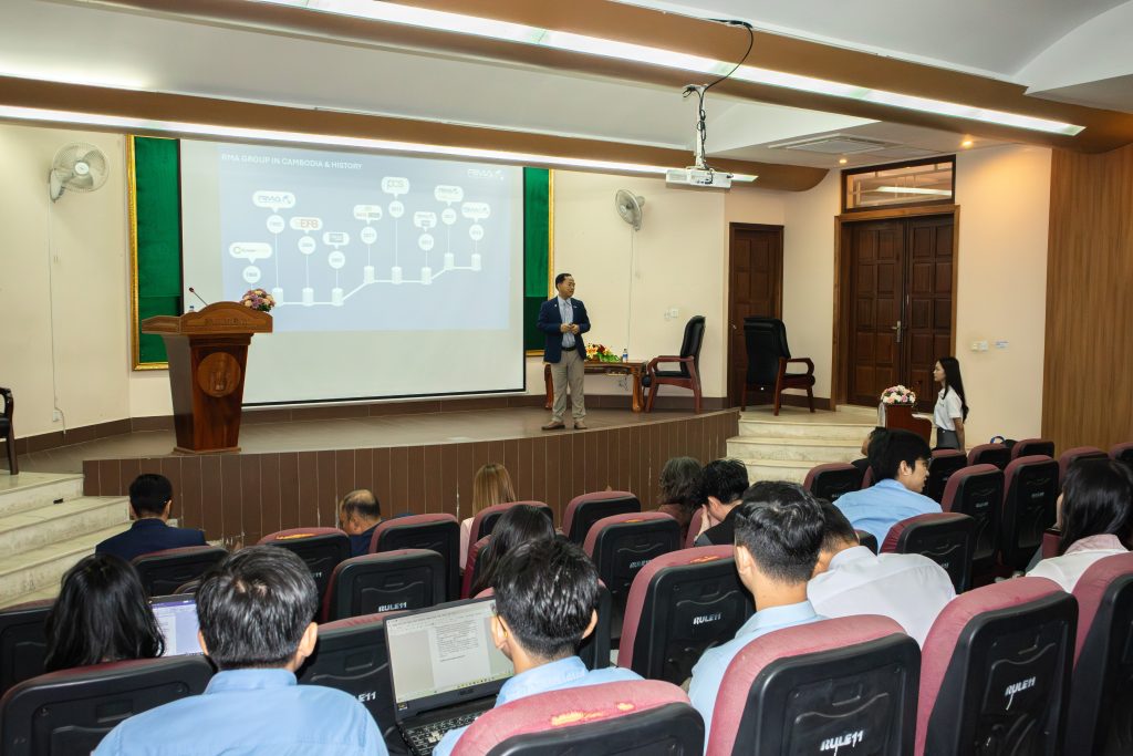 បន្ទាប់មក លោក អ៊ីម សារុន អ្នកគ្រប់គ្រងធនធានមនុស្ស RMA Cambodia បានធ្វើបទបង្ហាញណែនាំពី RMA Cambodia។ RMA Cambodia គឺជាស្ថាប័នមួយដែលចូលរួមសំខាន់ក្នុងសេដ្ឋកិច្ចកម្ពុជា ដែលផ្តល់សេវាកម្មក្នុងវិស័យ រថយន្ត ឧបករណ៍ធ្ងន់ កសិកម្ម ការដឹកជញ្ជូន សេវាកម្មហិរញ្ញវត្ថុ និងជួល និងបានរួមចំណែកយ៉ាងសកម្មក្នុងការអភិវឌ្ឍប្រទេស។